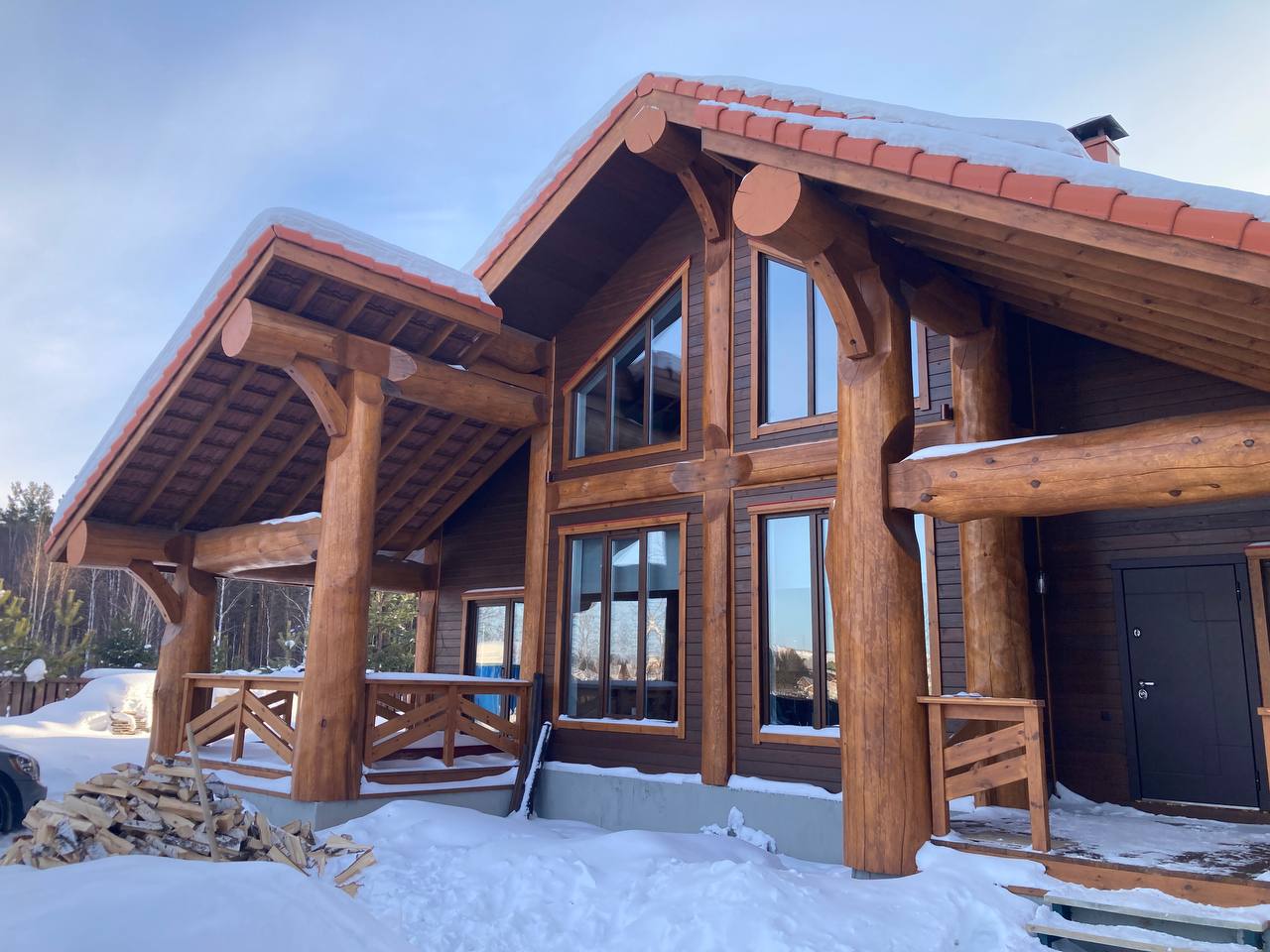 Внешний вид деревянного дома состоит из круглого или квадратного бревна и деревянных элементов, таких как дверные, оконные рамы, перила и крыльцо.